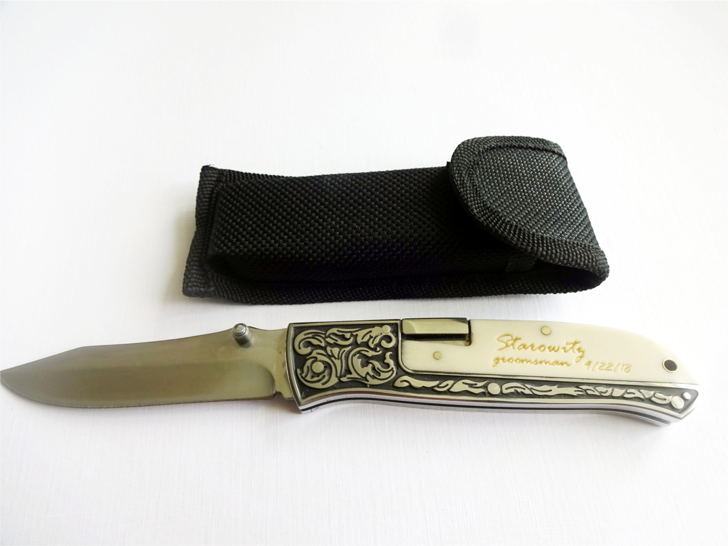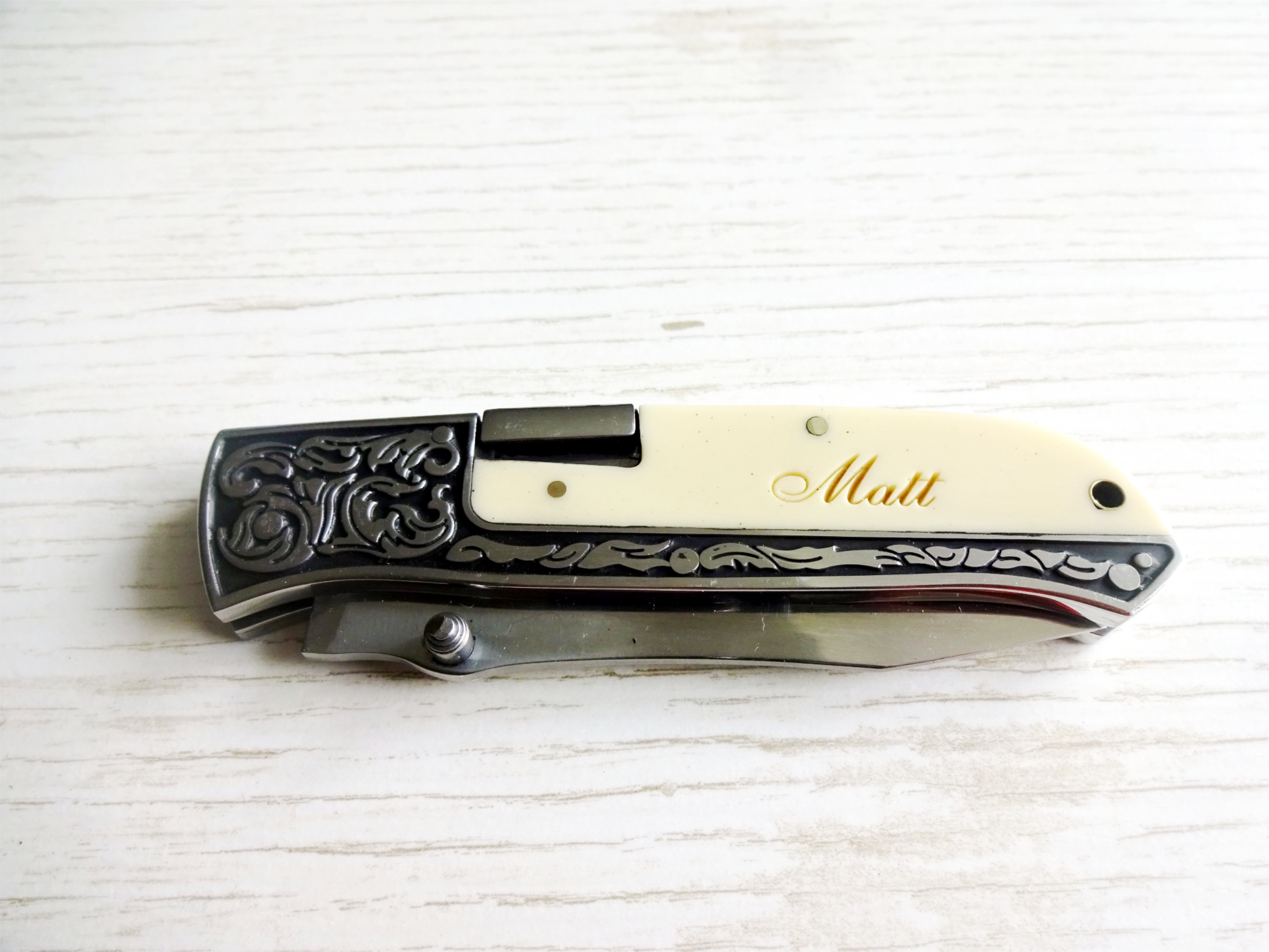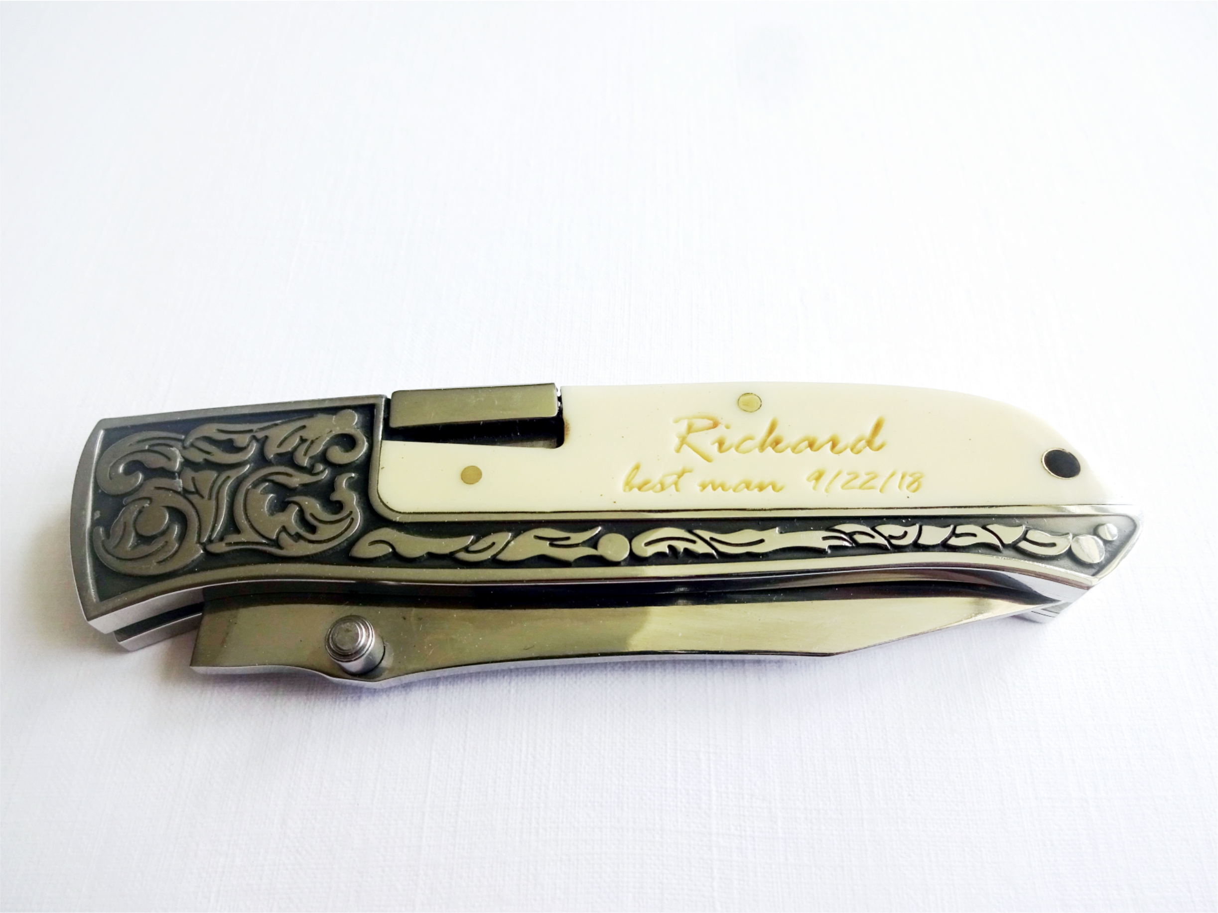 Pocket Knives are engraved with the name/ text provided to us. We make a nice dark text on the handle. It is very clear and will never wear off as it is deeply inscription.
