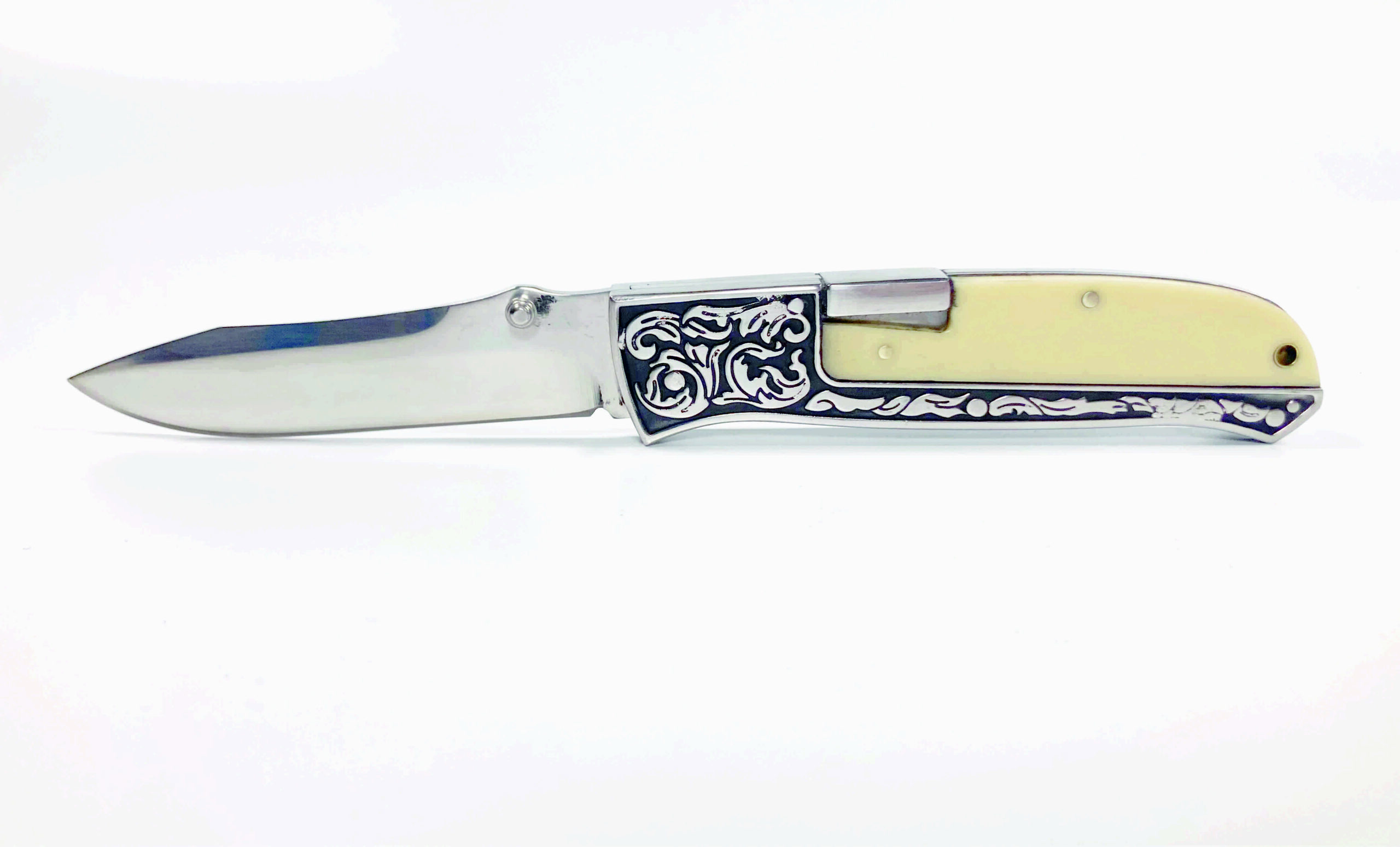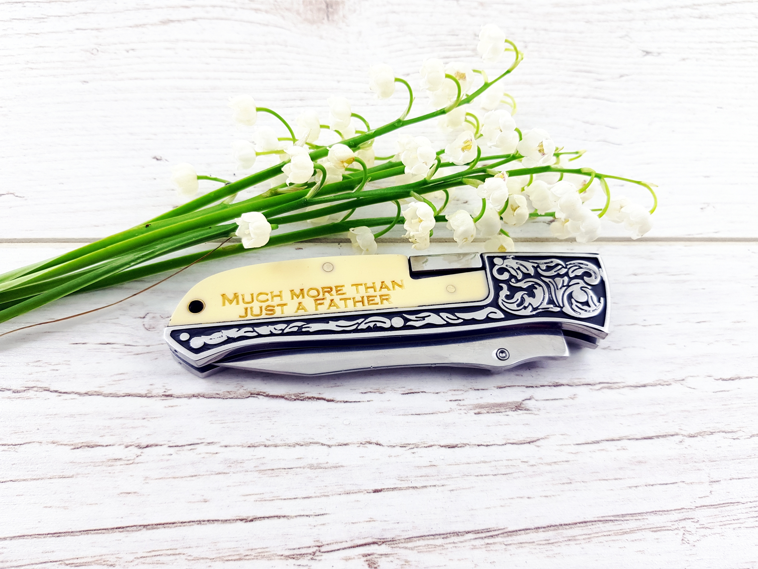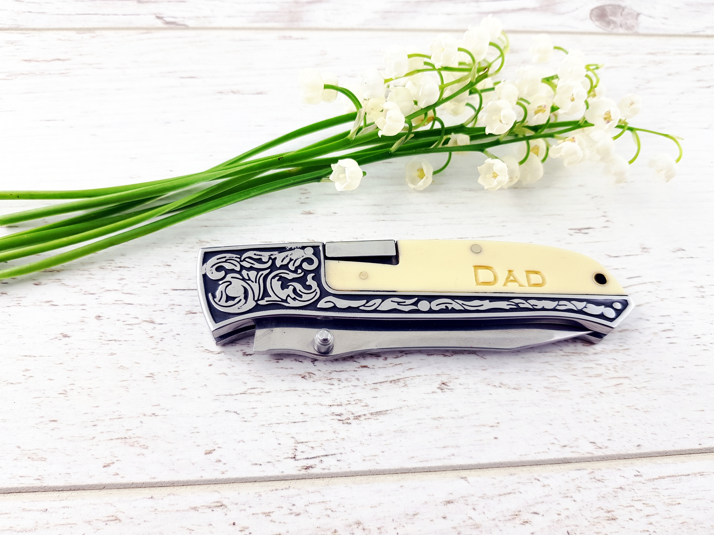 Pocket Knives are engraved with the name/ text provided to us. We make a nice dark text on the handle. It is very clear and will never wear off as it is deeply inscription.