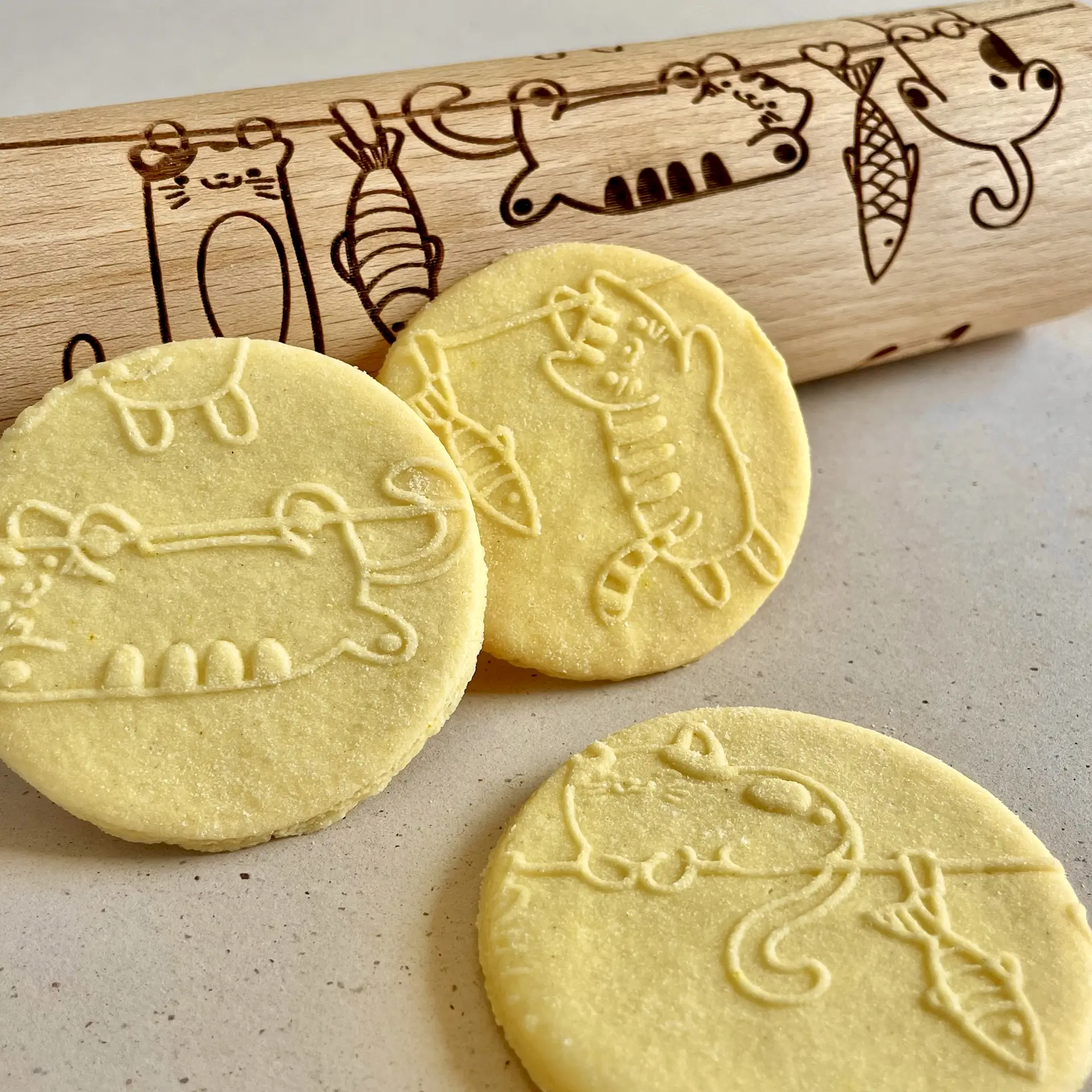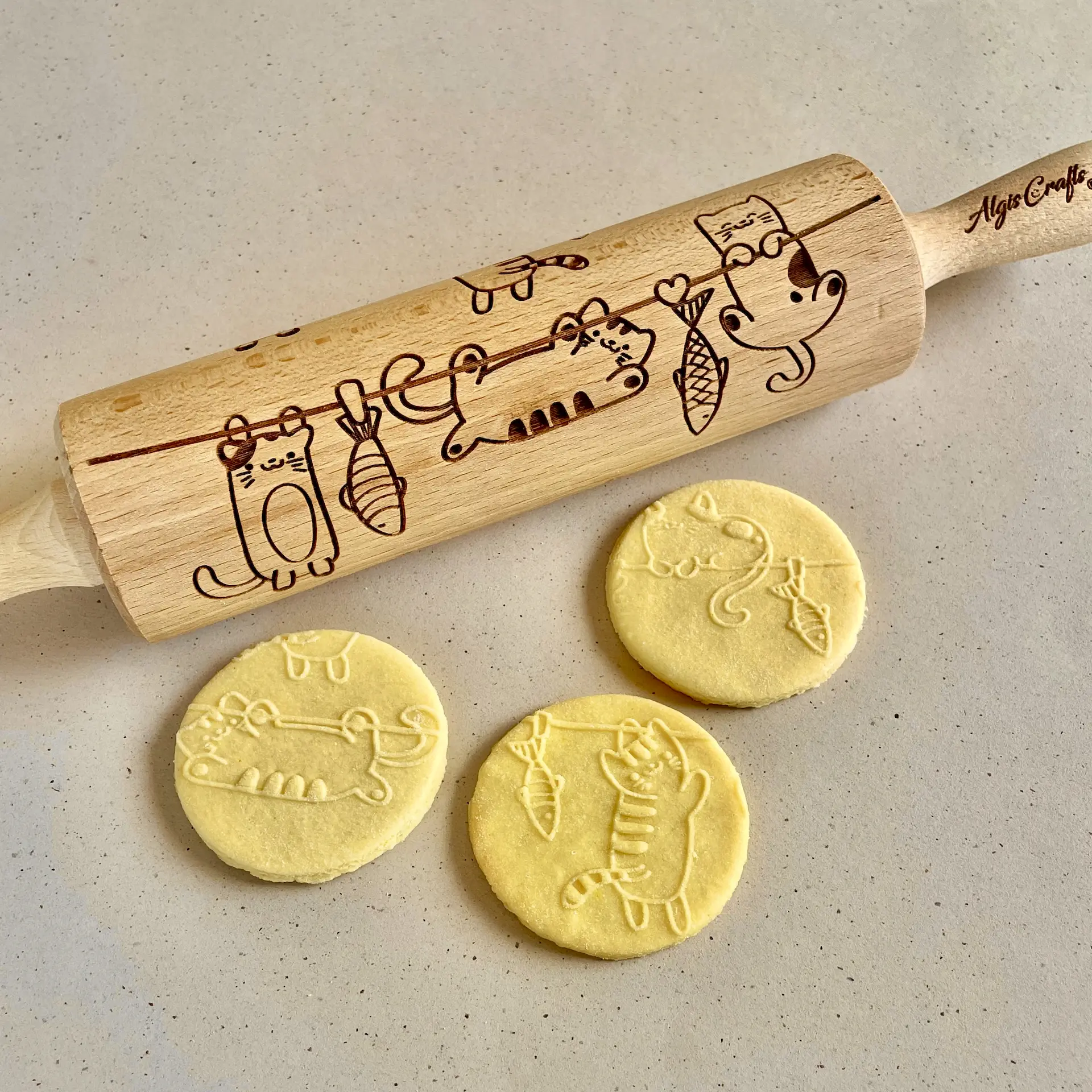 The rolling pins are designed to be the ideal size with a spacious surface for engraving your favorite designs. They measure 15 inches (38 cm) with handles, an embossing part of 7.9 inches (20 cm) and a diameter of 2.4 inches (6 cm), all made from premium-quality beech wood. Each rolling pin is laser engraved with precision, hand polished, and finished off with a protective wood conditioner for long-lasting durability. Since it’s a natural wood product, each rolling pin is unique with slight color variations and visible wood rings on the engraved surface, making it one-of-a-kind just for you!