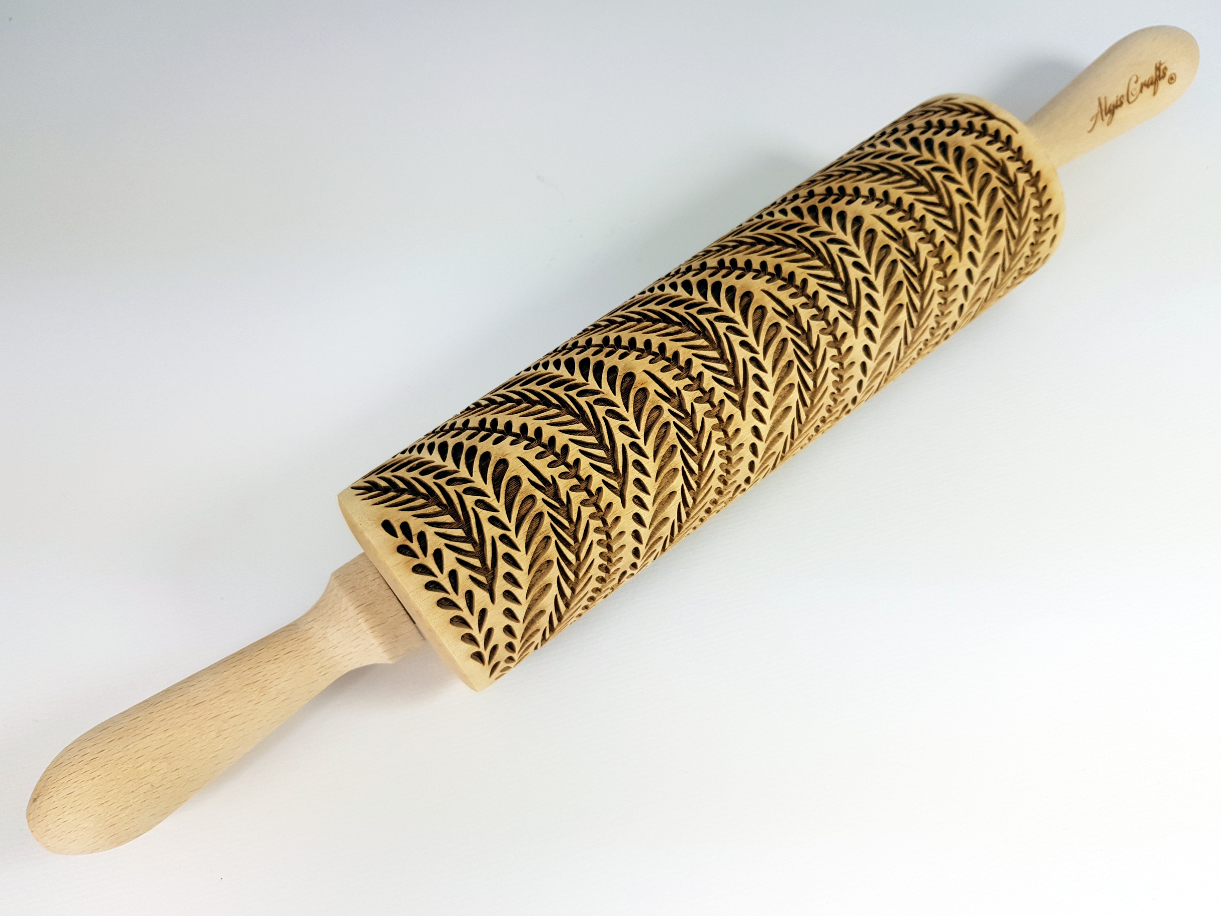 The rolling pins are designed to be the ideal size with a spacious surface for engraving your favorite designs. They measure 15 inches (38 cm) with handles, an embossing part of 7.9 inches (20 cm) and a diameter of 2.4 inches (6 cm), all made from premium-quality beech wood. Each rolling pin is laser engraved with precision, hand polished, and finished off with a protective wood conditioner for long-lasting durability. Since it’s a natural wood product, each rolling pin is unique with slight color variations and visible wood rings on the engraved surface, making it one-of-a-kind just for you!