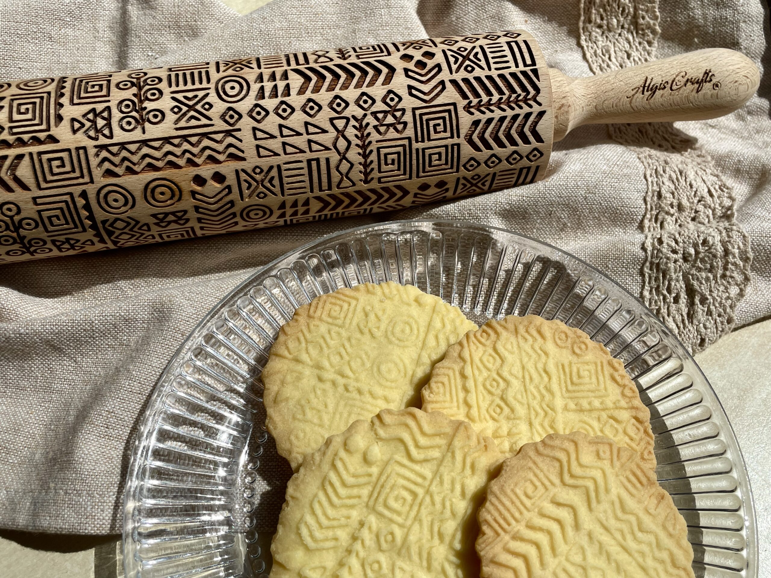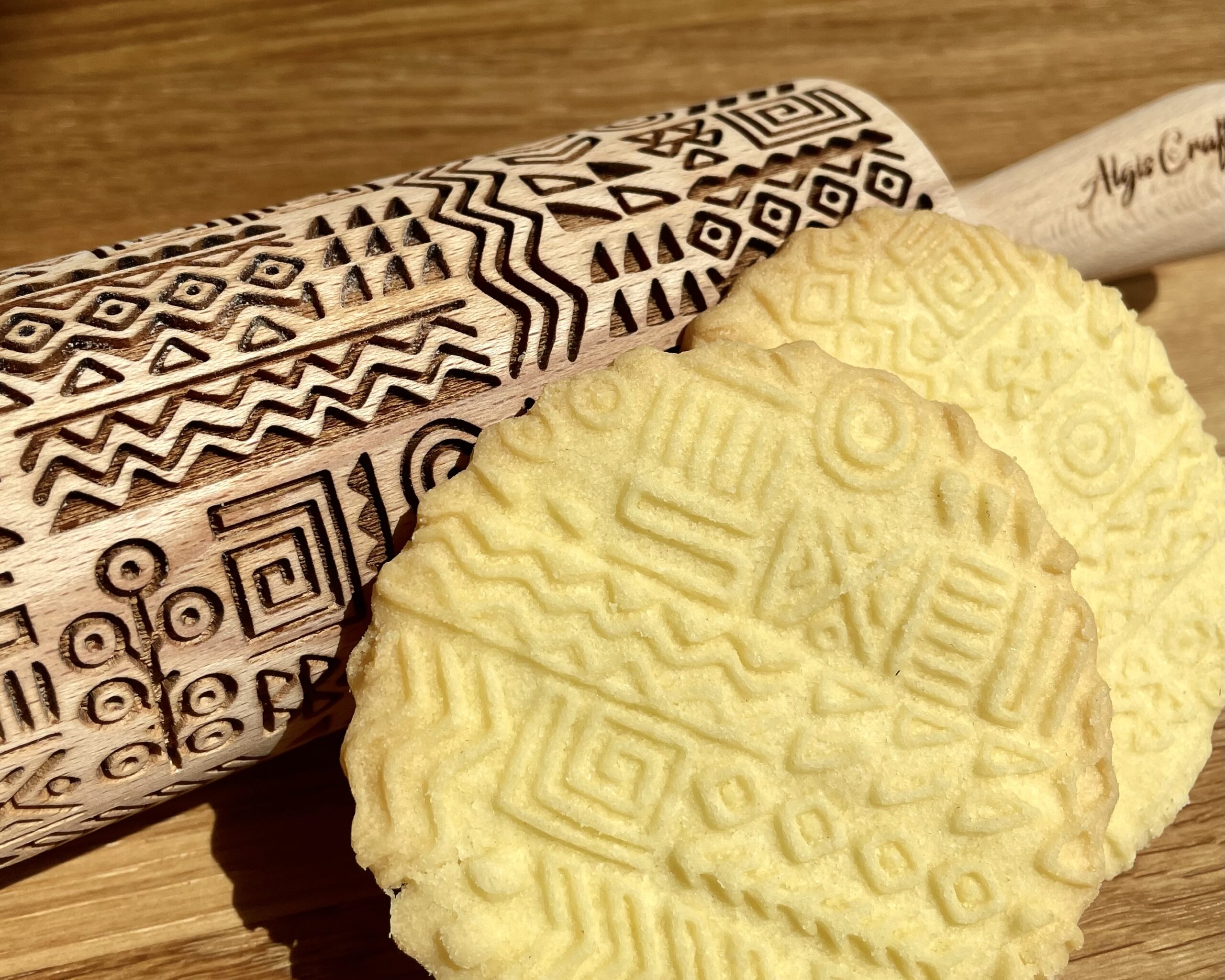 The rolling pins are designed to be the ideal size with a spacious surface for engraving your favorite designs. They measure 15 inches (38 cm) with handles, an embossing part of 7.9 inches (20 cm) and a diameter of 2.4 inches (6 cm), all made from premium-quality beech wood. Each rolling pin is laser engraved with precision, hand polished, and finished off with a protective wood conditioner for long-lasting durability. Since it’s a natural wood product, each rolling pin is unique with slight color variations and visible wood rings on the engraved surface, making it one-of-a-kind just for you!