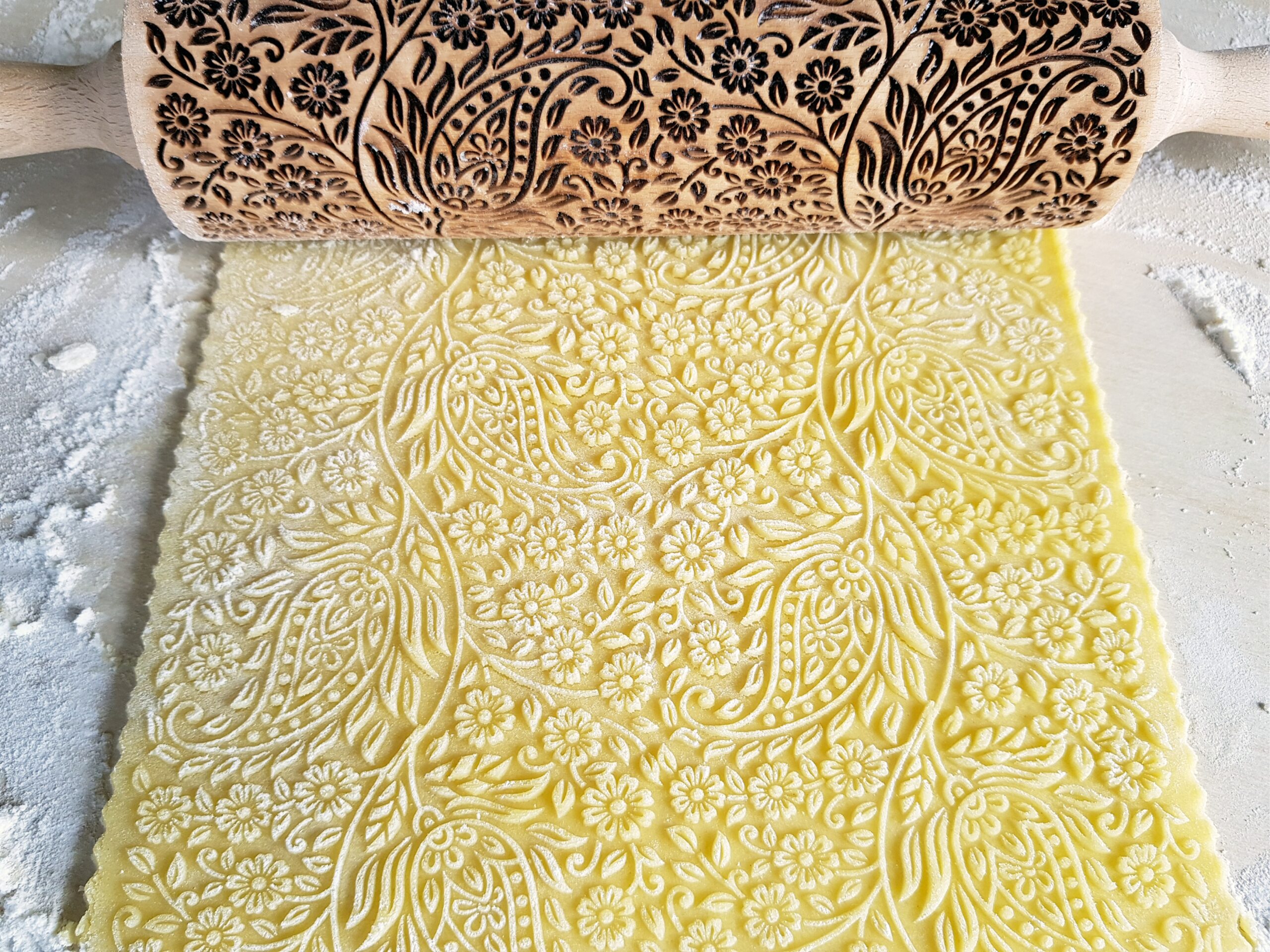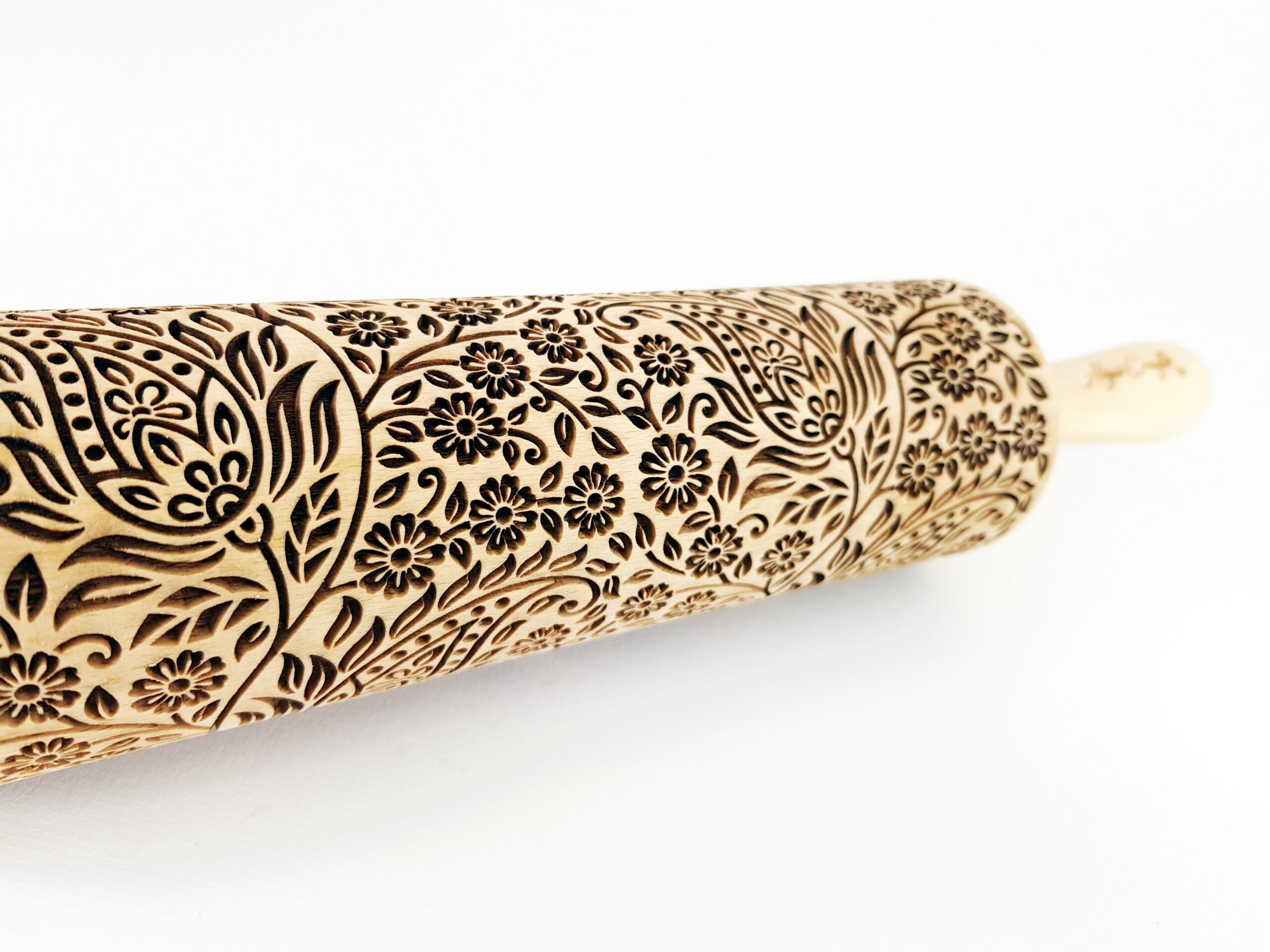 The rolling pins are designed to be the ideal size with a spacious surface for engraving your favorite designs. They measure 15 inches (38 cm) with handles, an embossing part of 7.9 inches (20 cm) and a diameter of 2.4 inches (6 cm), all made from premium-quality beech wood. Each rolling pin is laser engraved with precision, hand polished, and finished off with a protective wood conditioner for long-lasting durability. Since it’s a natural wood product, each rolling pin is unique with slight color variations and visible wood rings on the engraved surface, making it one-of-a-kind just for you!