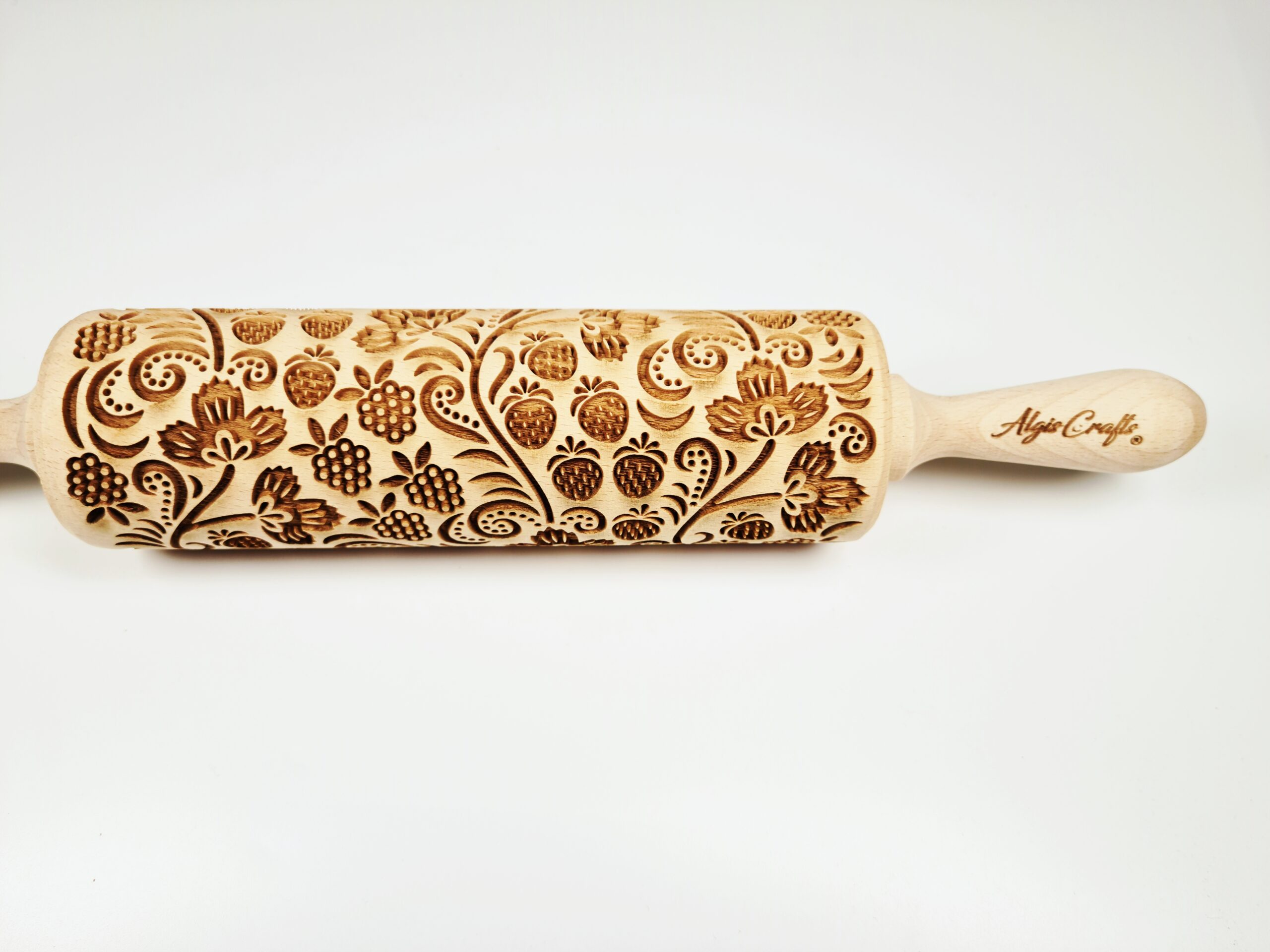The rolling pins are designed to be the ideal size with a spacious surface for engraving your favorite designs. They measure 15 inches (38 cm) with handles, an embossing part of 7.9 inches (20 cm) and a diameter of 2.4 inches (6 cm), all made from premium-quality beech wood. Each rolling pin is laser engraved with precision, hand polished, and finished off with a protective wood conditioner for long-lasting durability. Since it’s a natural wood product, each rolling pin is unique with slight color variations and visible wood rings on the engraved surface, making it one-of-a-kind just for you!