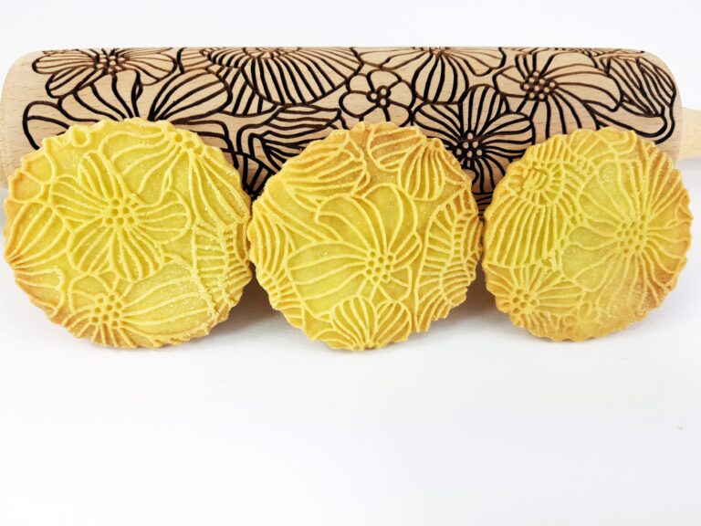 The rolling pins are designed to be the ideal size with a spacious surface for engraving your favorite designs. They measure 15 inches (38 cm) with handles, an embossing part of 7.9 inches (20 cm) and a diameter of 2.4 inches (6 cm), all made from premium-quality beech wood. Each rolling pin is laser engraved with precision, hand polished, and finished off with a protective wood conditioner for long-lasting durability. Since it’s a natural wood product, each rolling pin is unique with slight color variations and visible wood rings on the engraved surface, making it one-of-a-kind just for you!