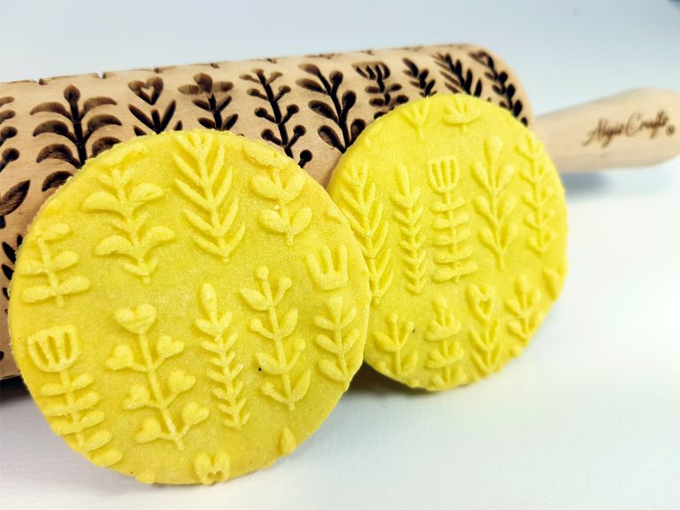 The rolling pins are designed to be the ideal size with a spacious surface for engraving your favorite designs. They measure 15 inches (38 cm) with handles, an embossing part of 7.9 inches (20 cm) and a diameter of 2.4 inches (6 cm), all made from premium-quality beech wood. Each rolling pin is laser engraved with precision, hand polished, and finished off with a protective wood conditioner for long-lasting durability. Since it’s a natural wood product, each rolling pin is unique with slight color variations and visible wood rings on the engraved surface, making it one-of-a-kind just for you!